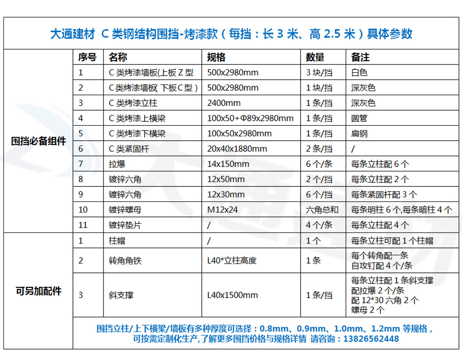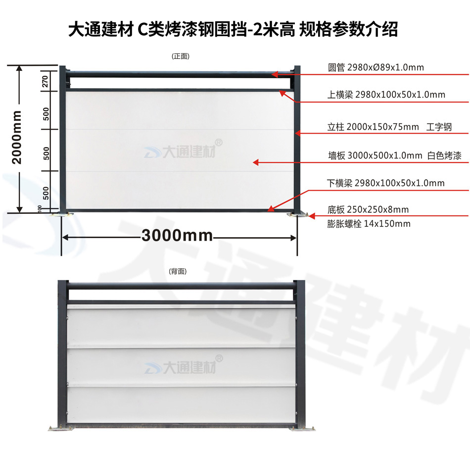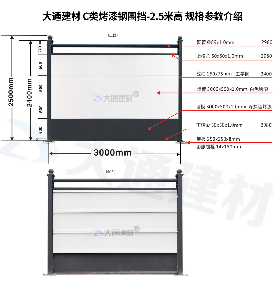 大通建材 C類裝配式鋼圍擋-烤漆款的烤漆鋼板厚度是1.0mm,采用150*75mm工字鋼深灰色烤漆立柱,同時(shí)每一擋圍擋的長度是3m,高度是2.5m,其它具體參數(shù)規(guī)格請(qǐng)參照上述展示的圍擋參數(shù)圖。